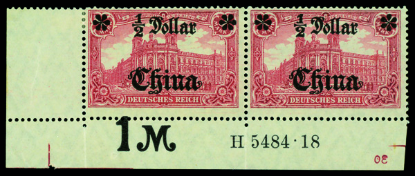 9537 og 44 I B M image1906, $½ on 1m dark carmine 'China' overprint, bottom margin pair with HAN #, o.g., hinge remnants re-inforcing separations, Fine.