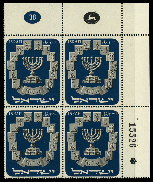 9656 nhbl 55 image1952, 1000p Menorah (Scott 55), plate block of 4, o.g., never hinged, Very Fine.