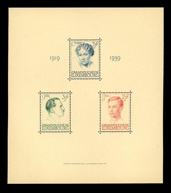 9667 nh 217 image1939, Reign Anniversary of Grand Duchess Charlotte, souvenir sheet of 3 (Scott 217), o.g., never hinged, Extremely Fine.