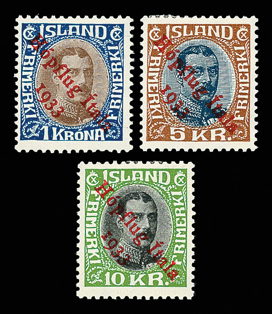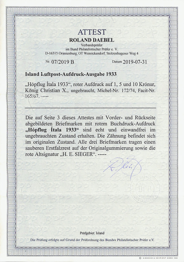 9654 og C12-C14 imageAirmail, 1933, "Hopflug Itala" complete (Scott C12-C14), set of 3, o.g., hinge remnants, Very Fine, signed, with 2019 BPP-Dabel certificate.