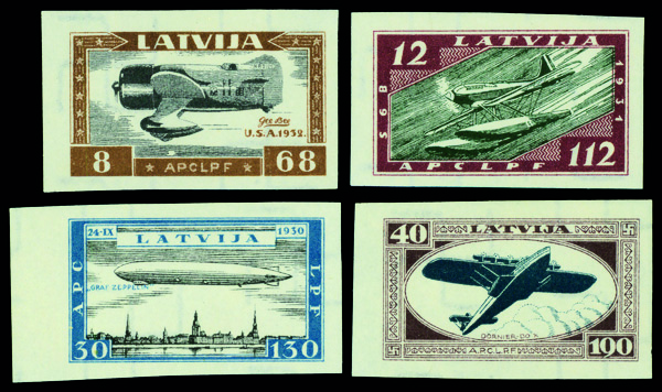 9663 nh CB21a-CB24a image1933, Latvian Avaitors Assistance, imperf., complete (Scott CB21a-CB24a), set of 4, o.g., never hinged, Very Fine to Extremely Fine.