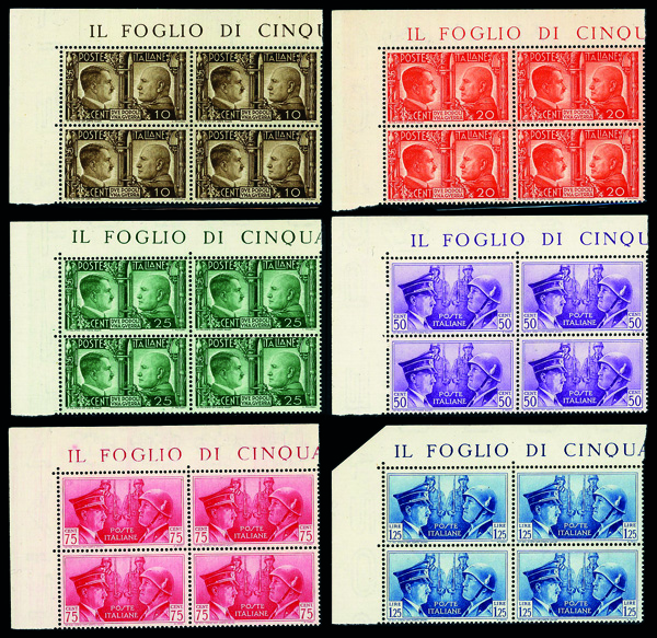 9657 nhbl 413-418 image1941, Rome-Berlin Axis, complete (Scott 413-418), set of 6, corner margin blocks of 4, o.g., never hinged, Very Fine.