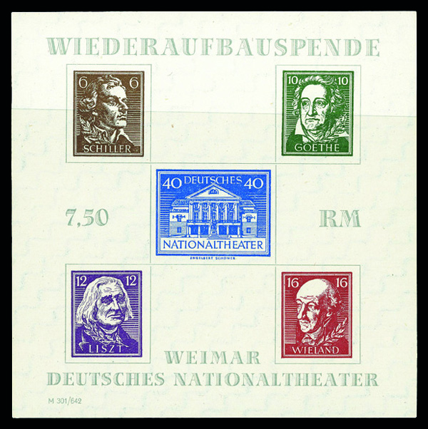 9642 nh 10NB11 image1949 Goethe souvenir sheet (Scott 10NB11), o.g., never hinged, Extremely Fine.
