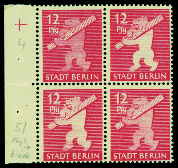 9643 nhbl 5 A VII image1945, 12pf Berlin Bear, 'Bear with Spat smeared' variety, block of 4, variety is LL stamp, o.g., never hinged, Fine.