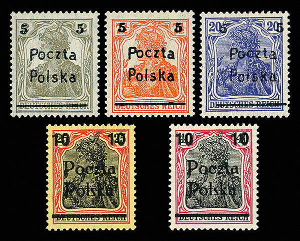 9683 nh 72-76 image1919, Posen Issue, 5pf-10pf surcharges, complete (Scott 72-76), set of 5, o.g., never hinged, Very Fine, with 2013 Ceremuga certificate.