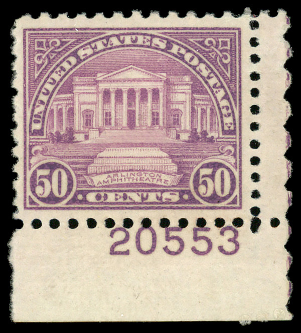 9188 nh 701 image1931, 50¢ Arlington Amphitheater, rotary press printing (Scott 701), plate number single, o.g., never hinged (gum skips), Extremely Fine.