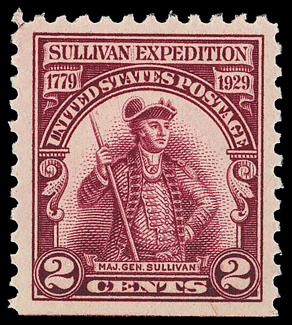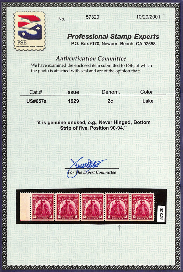 9170 nh 657a image1929, 2¢ Sullivan Expedition, lake color error (Scott 657a), bottom margin single, o.g., never hinged, Extremely Fine, with 2001 P.S.E. certificate for strip.