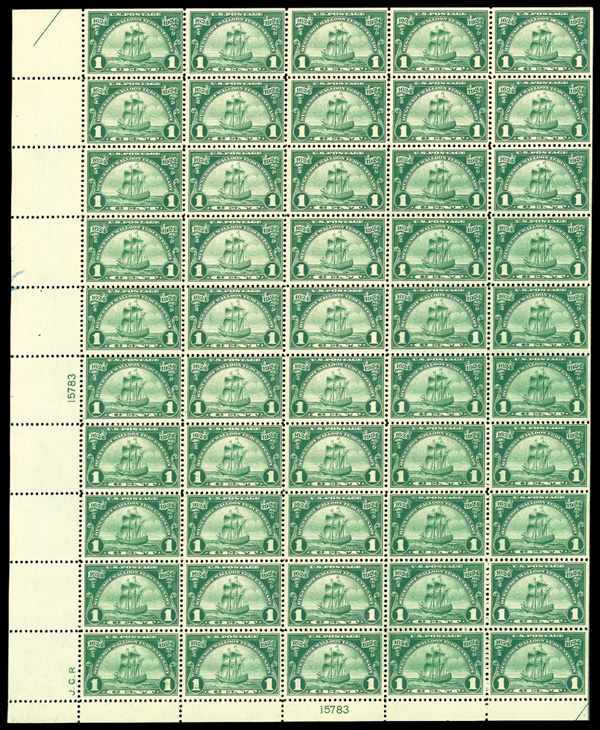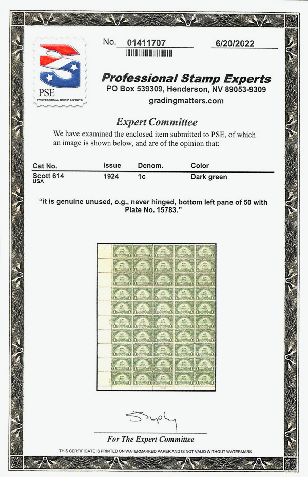 9163 nhbl 614 image1924, 1¢ Huguenot-Walloon (Scott 614), bottom left full pane of 50 with plate number 15783, o.g., never hinged, pristine with intense color and sharp detail, Fine to Very Fine, with 2022 P.S.E. certificate.