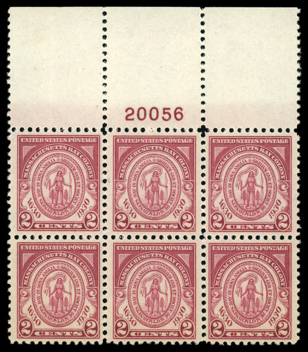 9185 nhbl 682 image1930, 2¢ Massachusetts Bay Colony (Scott 682), plate block of 6, o.g., never hinged, Extremely Fine.