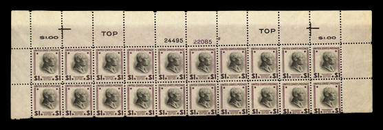9193 nhbl 832 image1938, Presidential Issue, $1 Wilson (Scott 832), plate block of 20, o.g., never hinged, Fine to Very Fine.