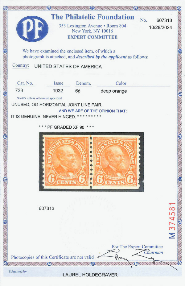 9190 nh 723 image1932, 6¢ Garfield, rotary press printing, horizontal coil (Scott 723), joint line pair, o.g., never hinged, Extremely Fine, with 2024 P.F. certificate graded XF 90.
