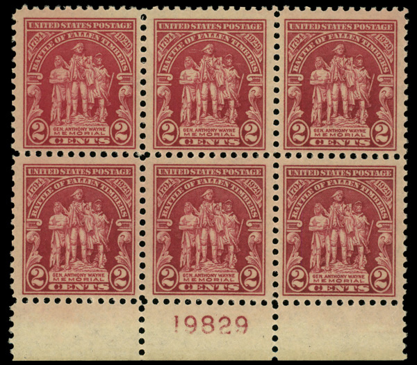 9184 nhbl 680 image1929, 2¢ Battle of Fallen Timbers (Scott 680), plate block of 6, o.g., never hinged, Very Fine to Extremely Fine.