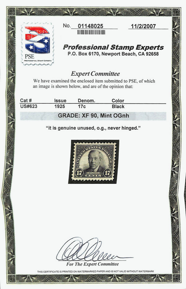 9166 nh 623 image1925, 17¢ Wilson (Scott 623), o.g., never hinged, Extremely Fine, with 2007 P.S.E. certificate graded XF 90.