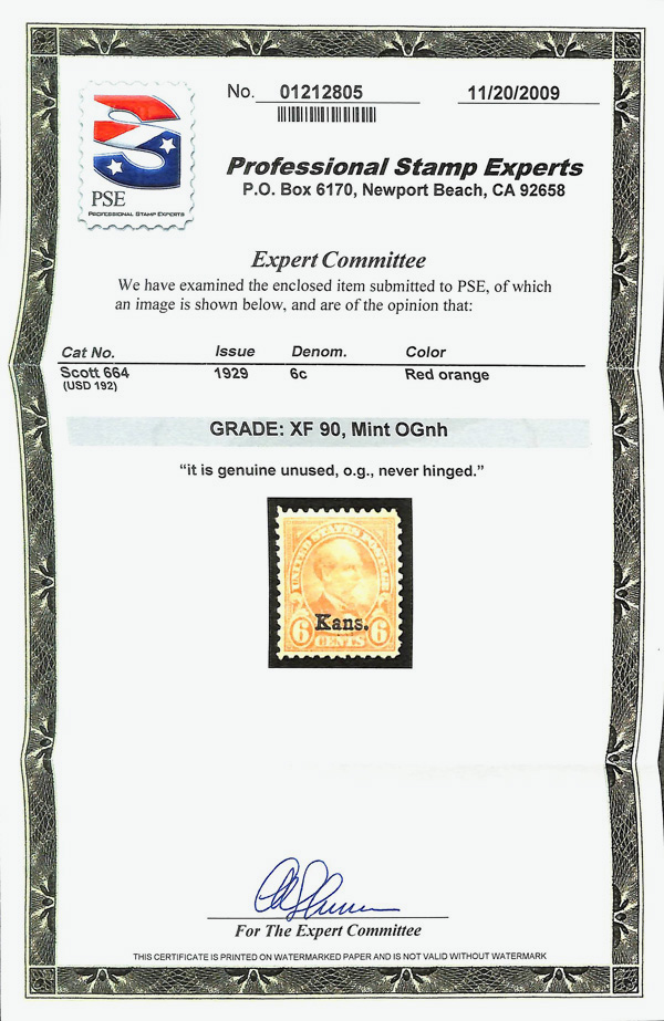 9175 nh 664 image1929, 6¢ Kans. (Scott 664), o.g., never hinged, Extremely Fine, with 2009 P.S.E. certificate graded XF 90.