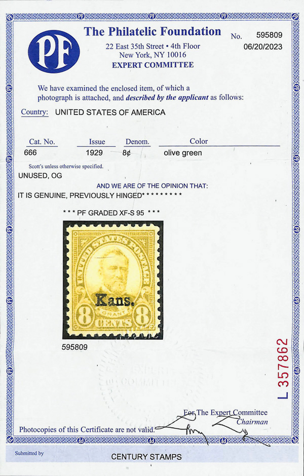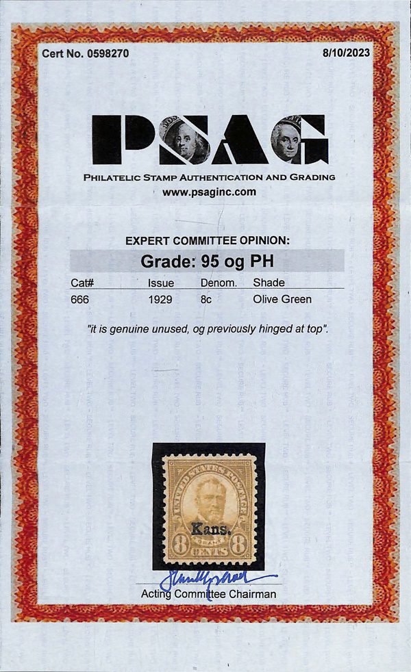 9177 og 666 image1929, 8¢ Kans. (Scott 666), o.g., very lightly hinged, Extremely Fine to Superb, with 2023 P.S.A.G. certificate graded XF-SUP 95 & 2023 P.F. certificate graded XF-S 95.