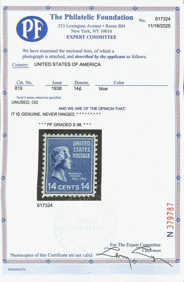 9192 nh 819 image1938, Presidential Issue, 14¢ Franklin Pierce (Scott 819), o.g., never hinged, Superb, with 2025 P.F. certificate graded SUP 98.