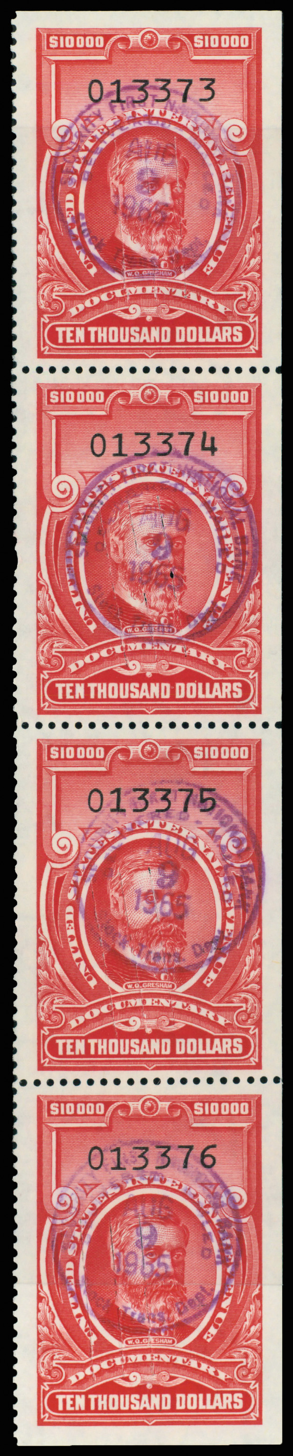9289 O R732 imageDocumentary, 1958, $10,000 Gresham (Scott R732), strip of 4, cut cancel, Extremely Fine.