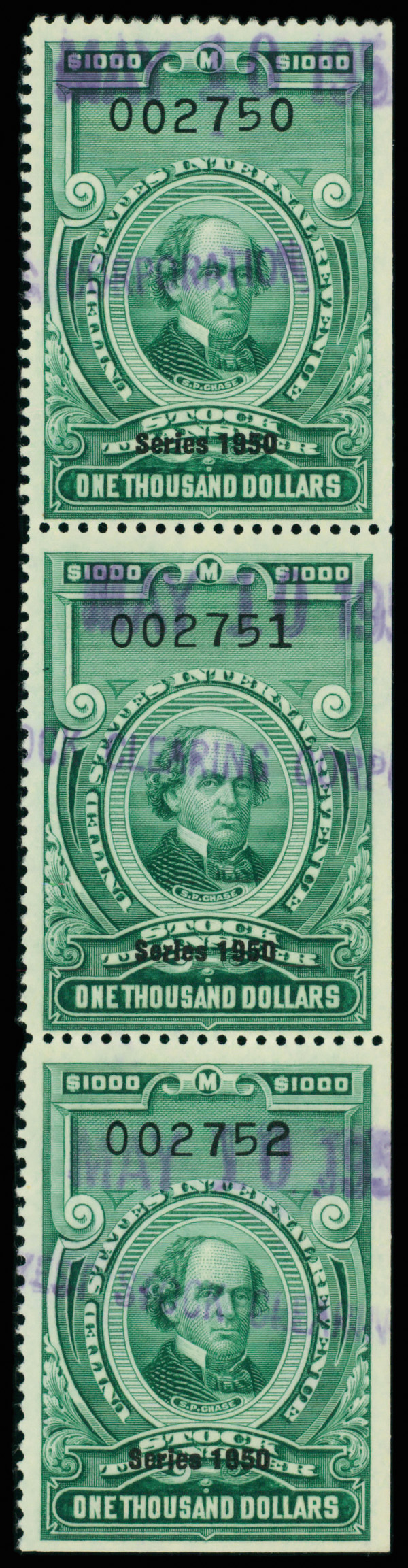 9292 O RD335 imageStock Transfer, 1950, $1,000 Chase (Scott RD335), vertical strip of 3, Fine.