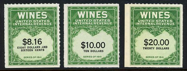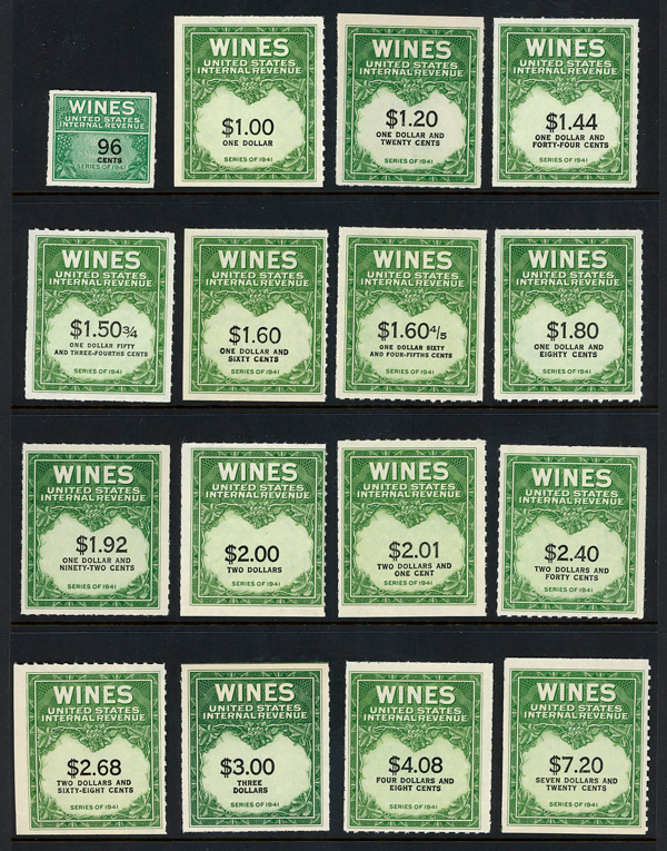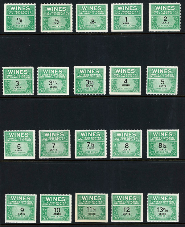 9293 ng RE108//RE203 imageWine Stamps, 1942-54, 1/5¢-$20.00 (Scott RE108//RE203), selection of 59 different, without gum as issued, Fine to Very Fine.
