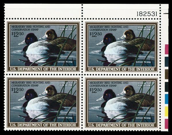 9304 nhbl RW56 imageFederal Duck Stamp, 1989, $12.50 Lesser Scaup (Scott RW56), plate block of 4, o.g., never hinged, Extremely Fine to Superb.