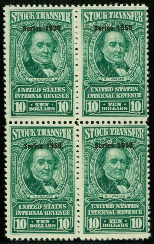 9290 ngbl RD328 imageStock Transfer, 1950, $10 Walker (Scott RD328), block of 4, unused without gum, Fine to Very Fine.