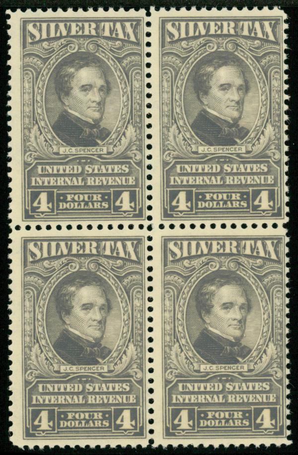 9294 nhbl RG123 imageSilver Tax, 1944, $4 gray (Scott RG123), block of 4, o.g., never hinged, Fine.