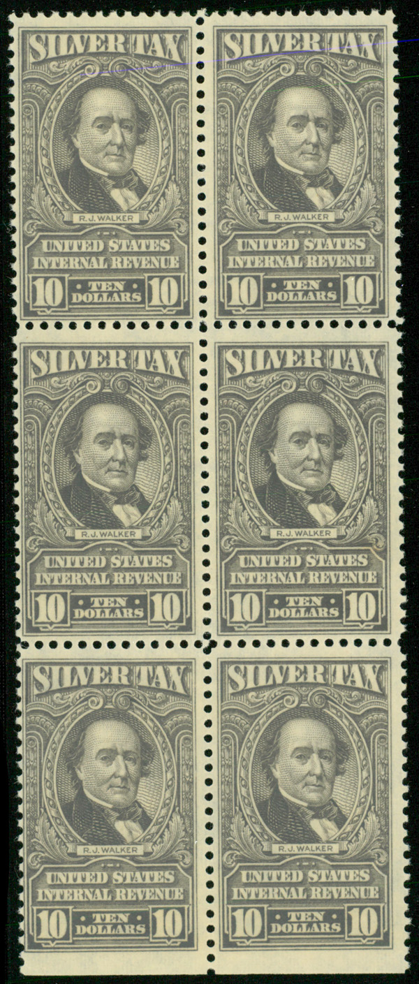 9296 nhbl RG125 imageSilver Tax, 1944, $10 gray (Scott RG125), bottom margin straight edge block of 6, o.g., never hinged (gum skips), Fine to Very Fine.