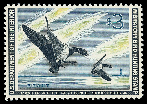 9300 og RW30 imageFederal Duck Stamp, 1963, $3 Brants (Scott RW30), plate number single, o.g., lightly hinged, Very Fine.