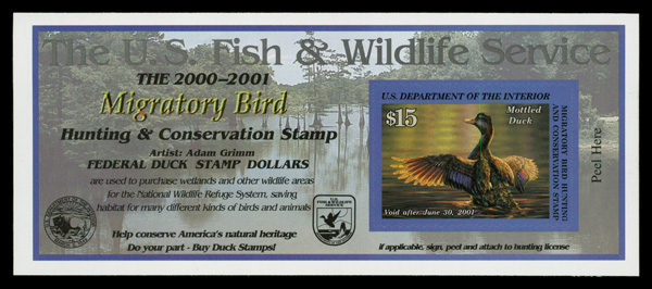 9307 nh RW67A imageFederal Duck Stamp, 2000, $15 Mottled Duck, self-adhesive (Scott RW67A), o.g., never hinged, Extremely Fine.