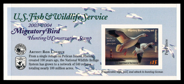 9308 nh RW70A imageFederal Duck Stamp, 2003, $15 Snow Geese, self-adhesive (Scott RW70A), o.g., never hinged, Extremely Fine.