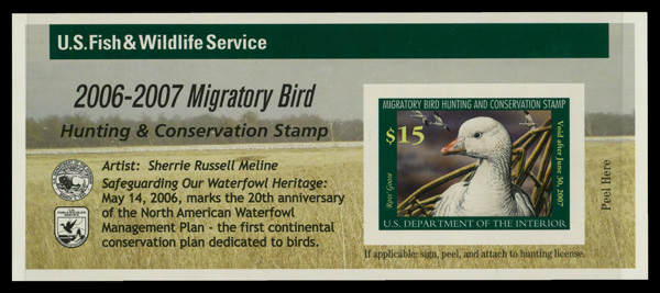 9310 nh RW73A imageFederal Duck Stamp, 2006, $15 Ross's Goose, self-adhesive (Scott RW73A), o.g., never hinged, Extremely Fine.