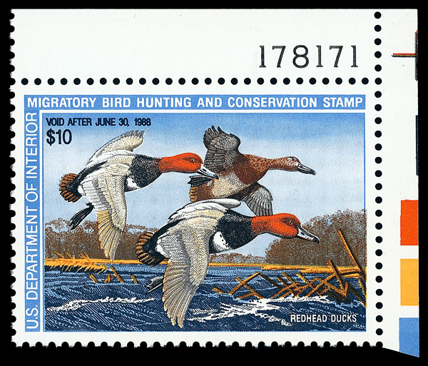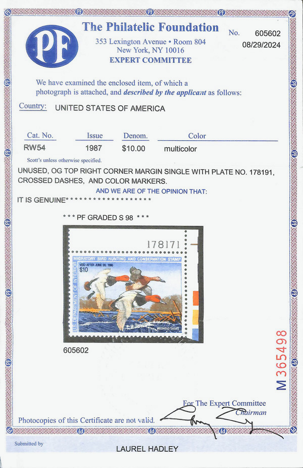 9302 nh RW54 imageFederal Duck Stamp, 1987, $10 Redhead Ducks (Scott RW54), plate number single, o.g., never hinged, Superb, with 2024 P.F. certificate graded SUP 98.