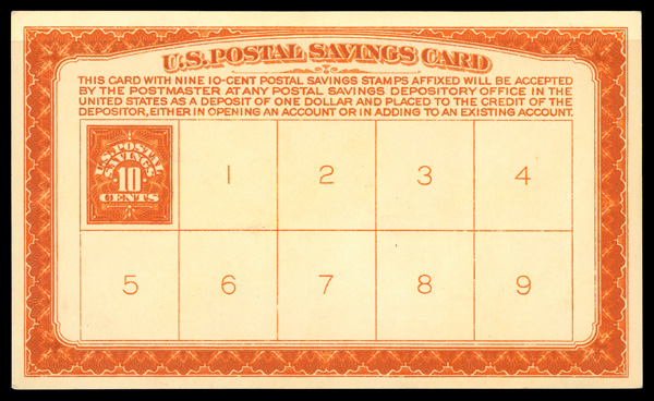 9312 nh PS2 imagePostal Savings, 1911, 10¢ orange, imprinted on deposit card (Scott PS2), o.g., never hinged, Extremely Fine.