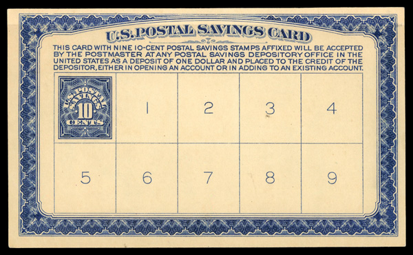 9313 nh PS5 imagePostal Savings, 1911, 10¢ deep blue, imprinted on deposit card (Scott PS5), o.g., never hinged, Very Fine.