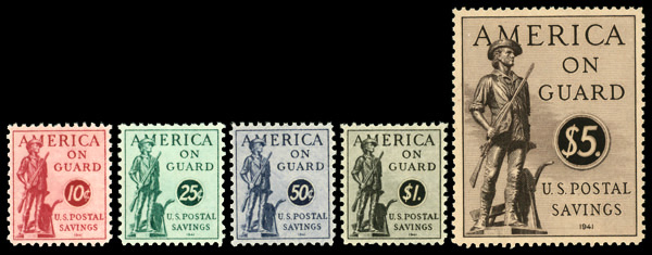 9318 nh PS11-PS15 imagePostal Savings, 1941, 10¢ to $5 complete (Scott PS11-PS15), o.g., never hinged, Extremely Fine.