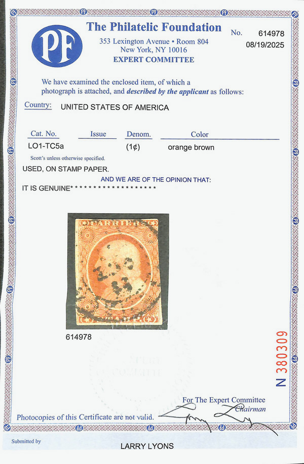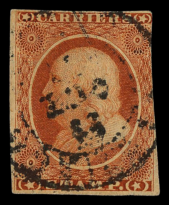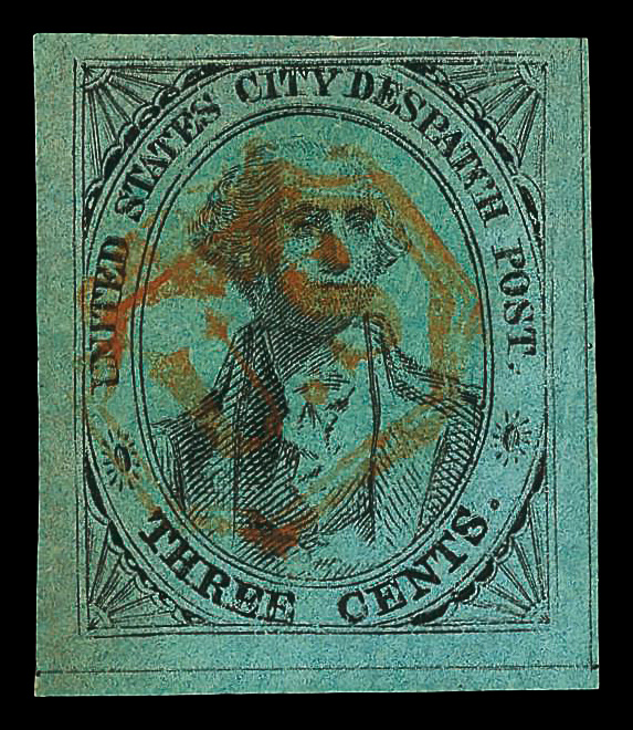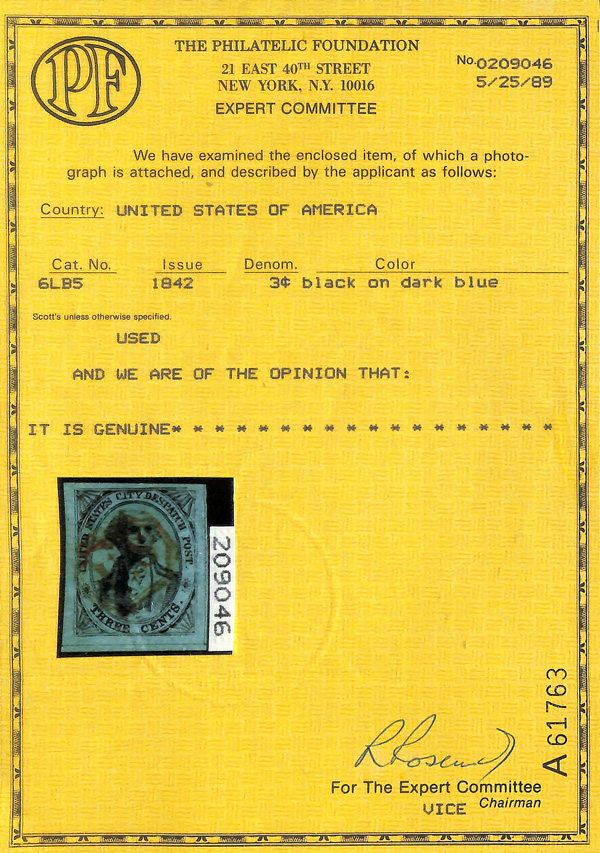 9285 O 6LB5 imageNew York, N.Y., U.S. City Despatch Post, 1842-45, 3¢ black on blue green (Scott 6LB5), Fine to Very Fine, with 1989 P.F. certificate.
