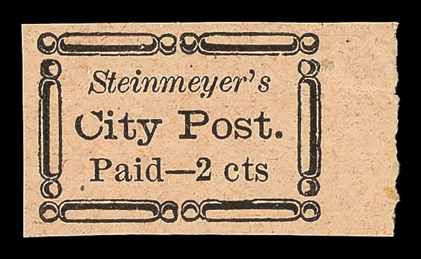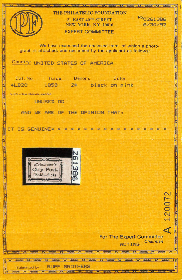9284 og 4LB20 imageCharleston, S.C., Steinmeyer's City Post, 1859, 2¢ black on pink (Scott 4LB20), right margin single, slightly disturbed o.g., Very Fine to Extremely Fine, with 1992 P.F. certificate.