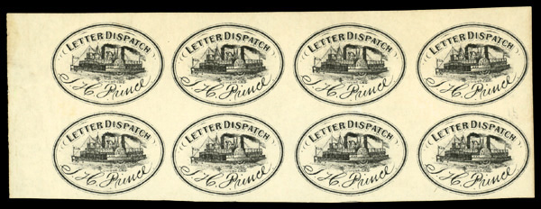 9286 nhbl 122L1 imagePrince's Letter Dispatch, 1861, black (Scott 122L1), left margin horizontal block of 8, o.g., never hinged; small thin, Very Fine, with 1996 P.F. certificate.