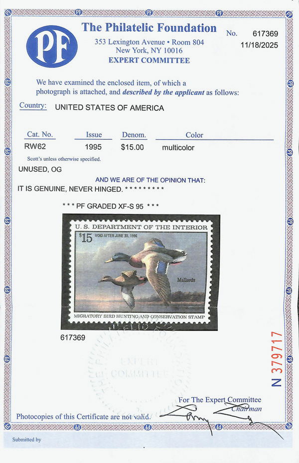 9306 nh RW62 imageFederal Duck Stamp, 1995, $15 Mallards (Scott RW62), o.g., never hinged, Extremely Fine to Superb, with 2025 P.F. certificate graded XF-SUP 95.