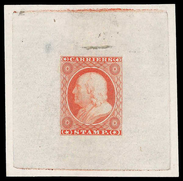 9282 E LO1-E4 imageCarrier, 1851 (1¢) Franklin essay, by Brazer (1952), in scarlet (Scott LO1-E4), complete design, die on glazed card, without gum as issued; without glazed card, Extremely Fine, with 2025 P.F. certificate.