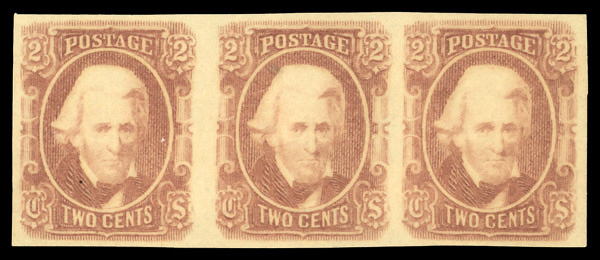 9354 ng 8 image1863, 2¢ brown red (Scott 8), strip of 3, unused without gum, Very Fine.