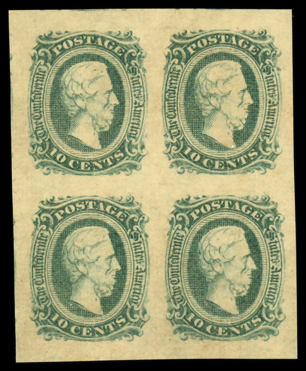 9357 nhbl 11d image1863, 10¢ green (Scott 11d), block of 4, o.g., never hinged, Superb.