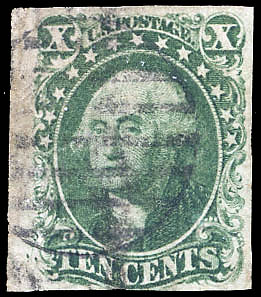 5002 O 15 image1855, 10¢ green, type III (Scott 15), grid cancel, 4 mostly large margins, Very Fine.