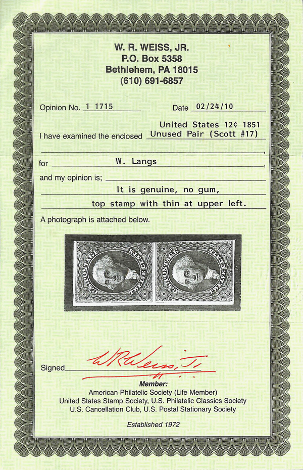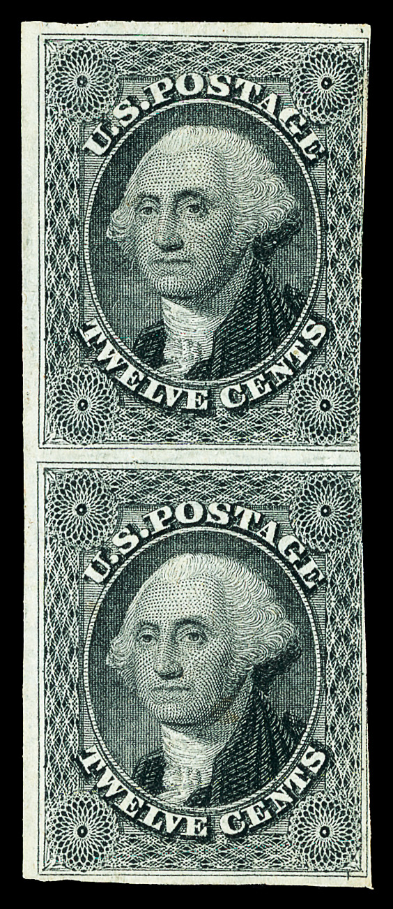 5003 ng 17 image1851, 12¢ gray black (Scott 17), pair, Nice pair with close cut on right side of the design but really not noticable in to the design. Top stamp has a thin to the top lrft corner., unused without gum, Fine to Very Fine, with 2010 Weiss certificate.