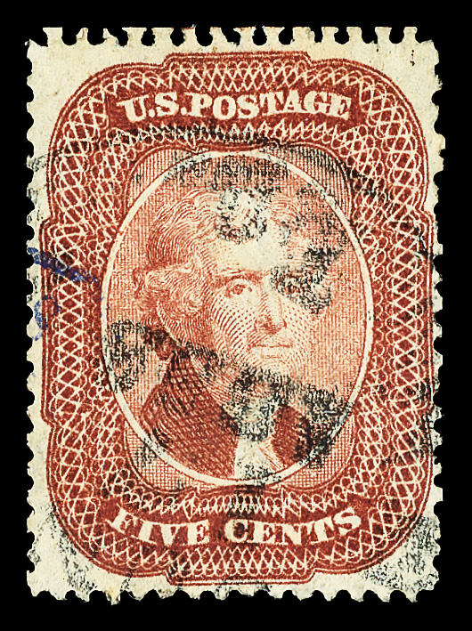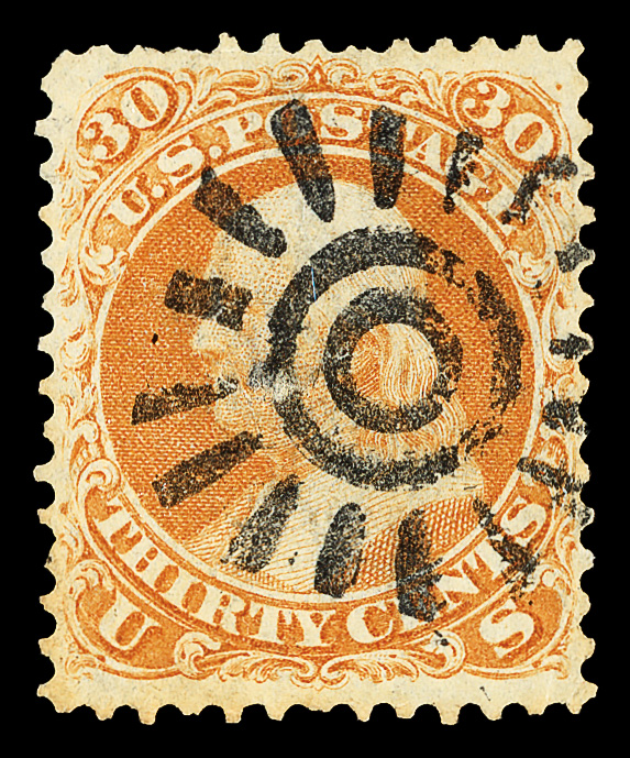 5015 O 71 image1861, 30¢ orange (Scott 71), four-margined example with a San Francisco cogwheel fancy cancel, Fine to Very Fine.
