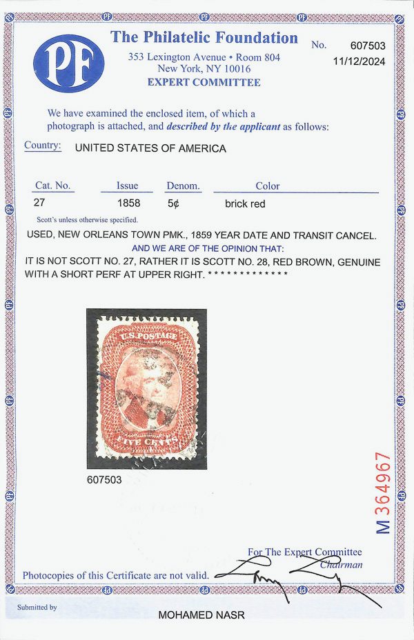 5007 O 28 image1857, 5¢ red brown, type I (Scott 28), single; Short perforations top right., Fine to Very Fine, with 2024 P.F. certificate.