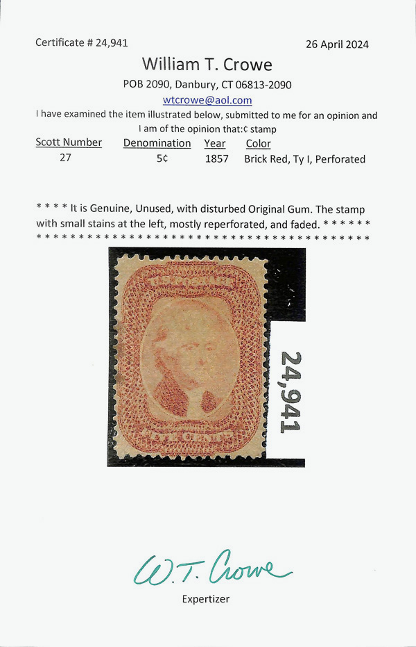 5006 og 27 image1858, 5¢ brick red, type I (Scott 27), single, disturbed o.g.; Small stains at the left, mostly reperforated and faded., Fine, with 2024 Crowe certificate.