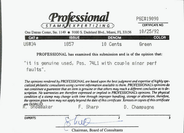 5008 O 34 image1857, 10¢ green, type IV (Scott 34), single, This is position 74L1.; Minor perforation faults, Fine to Very Fine, with 1992 P.S.E. certificate.