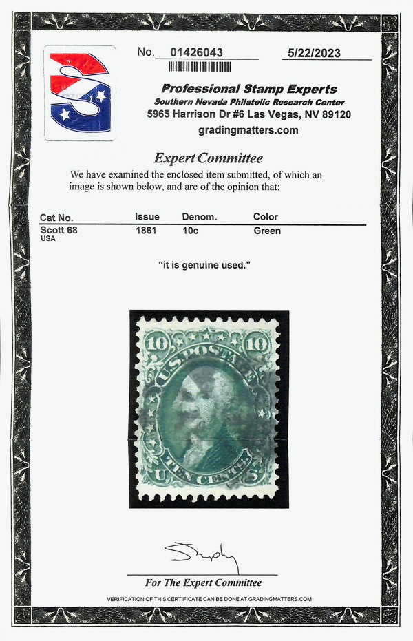 5012 O 68 image1861, 10¢ green (Scott 68), single, Fine to Very Fine, with 2023 P.S.E. certificate.
