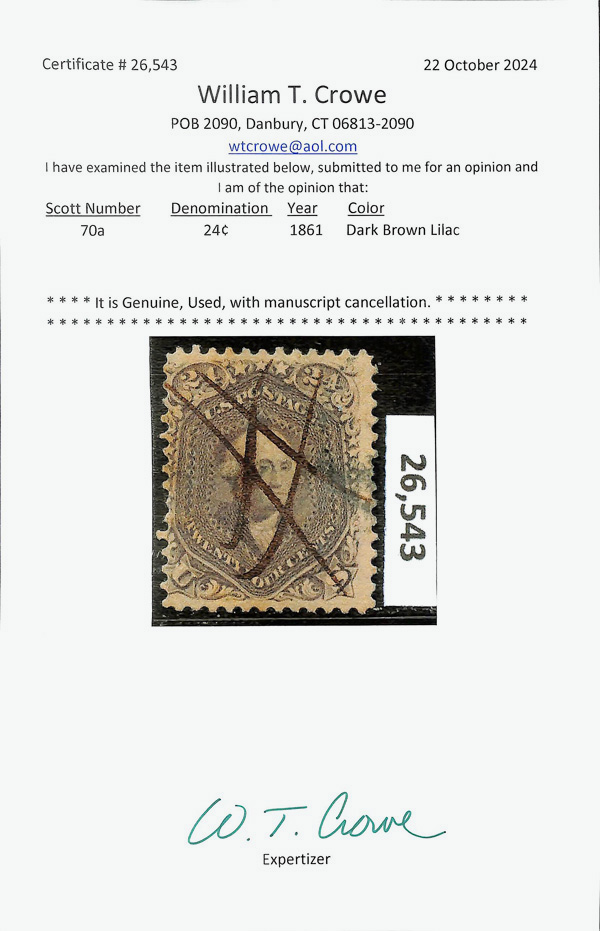 5014 O 70a image1862, 24¢ brown lilac (Scott 70a), manuscript cancel, Fine to Very Fine, with 2024 Crowe certificate.